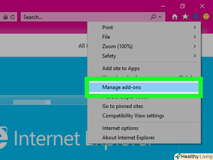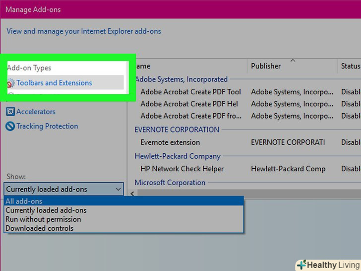 Натисніть " Надбудови». у новому вікні відкриються і відобразяться всі надбудови.- Щоб приховати панель інструментів, безпосередньо пов'язану з IE і не є стороннім сервісом, замість цього перейдіть до «Сервіс» і наведіть курсор на «панелі», а потім виберіть ту панель інструментів, яку ви хочете приховати. [3]