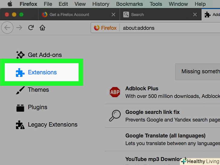 Натисніть "розширення" в лівій панелі вікна управління доповненнями.