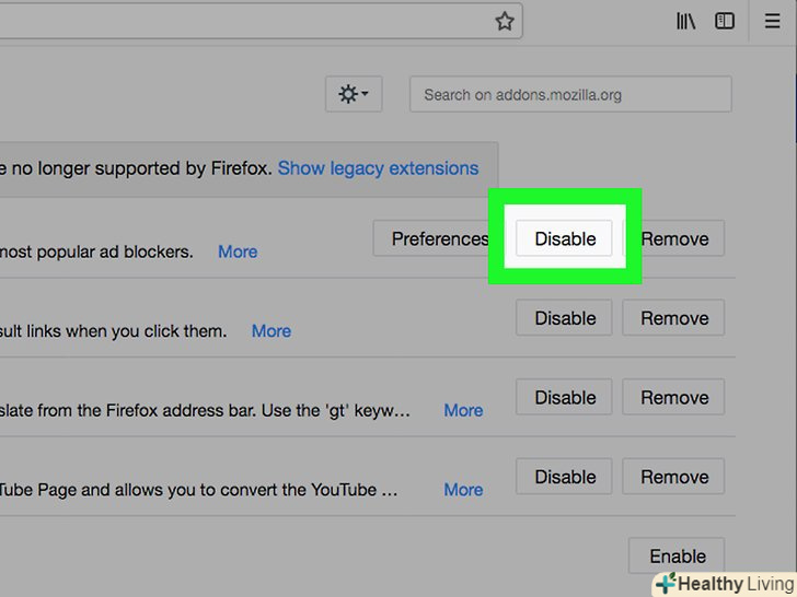 Натисніть «Вимкнути» поруч із панеллю інструментів, яку ви хочете приховати в Firefox.