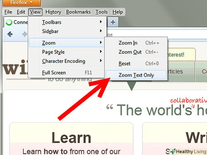 Натисніть на вкладку Вид, потім виберіть збільшити або Масштаб. у деяких браузерах меню знаходиться в правому верхньому куті. Відкрийте його і натисніть на кнопку +, щоб збільшити масштаб.
