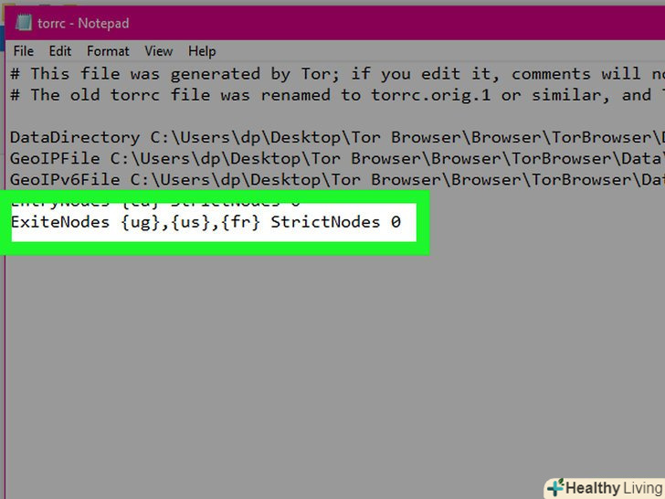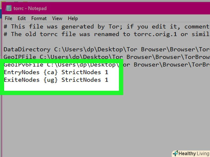 Введіть знайдені коди країн.введіть код країни, яка буде вхідним вузлом, всередині дужок{} справа в рядку «EntryNodes», а потім повторіть це з країною вихідного вузла в рядку «ExitNodes». У нашому прикладі (з Канадою та Угандою) рядки повинні виглядати так:EntryNodes {ca} StrictNodes1ExitNodes {ug} StrictNodes1