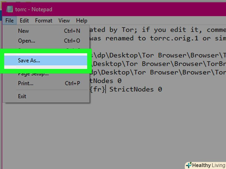 Замініть вихідний файл "torrc" на оновлений. так ви збережете налаштування з певними країнами:- Натисніть "Файл".