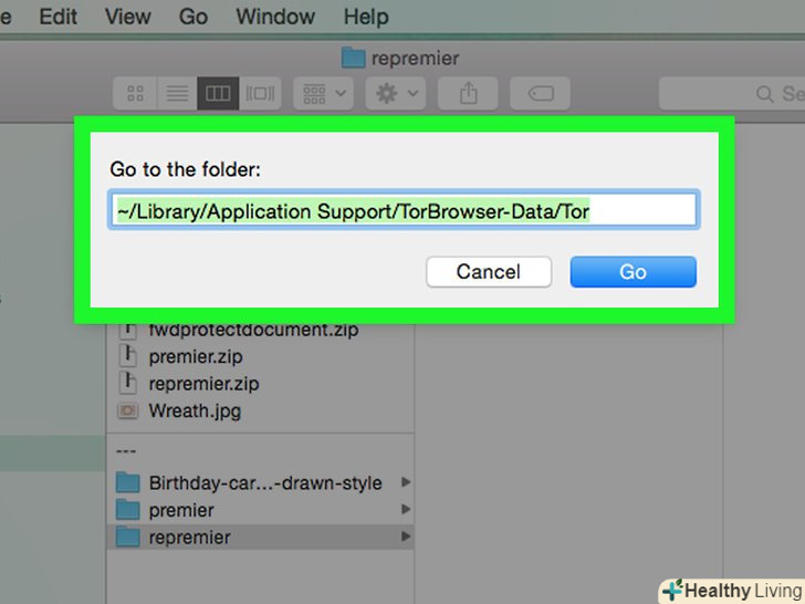 Введіть адресу папки з файлами Tor. Введіть ~/Library/Application Support/TorBrowser-Data/Tor/ натисніть ⏎ Return. Відкриється папка з файлом "torrc". [2]
