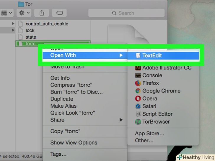Відкрийте файл «torrc» в TextEdit.двічі клацніть по файлу "torrc«, а потім виберіть» TextEdit", коли буде запропоновано вибрати програму. Тепер файл "torrc" можна відредагувати.