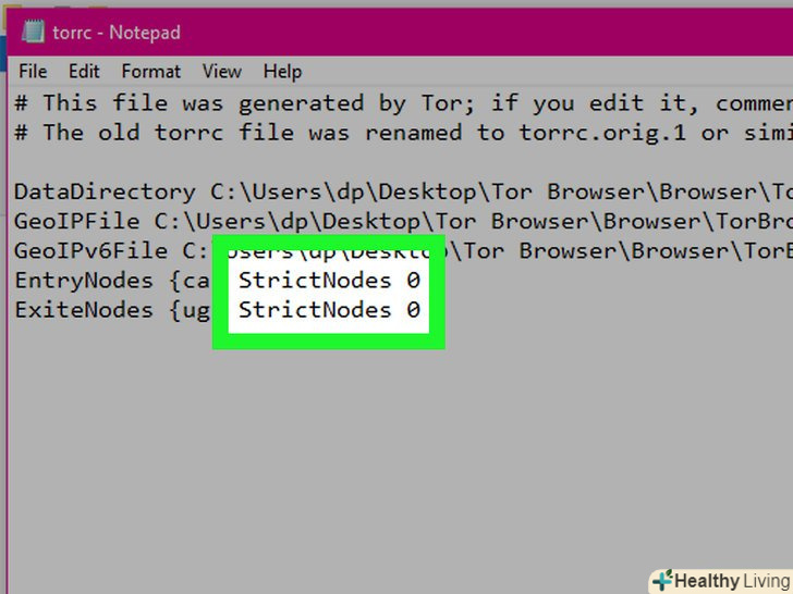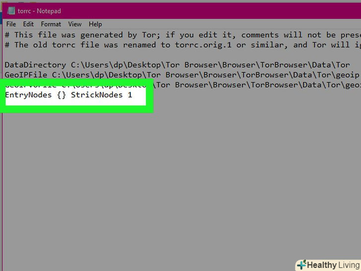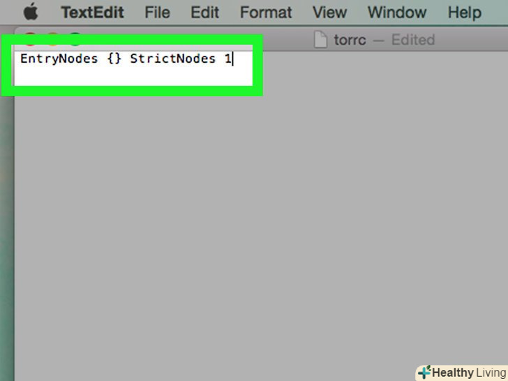 Додайте рядок "EntryNodes". Поставте курсор під останнім рядком, а потім введіть EntryNodes {} StrictNodes 1 натисніть ↵ Enter.[1]