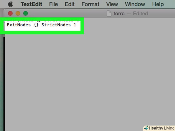 Додайте рядок "ExitNodes". Введіть ExitNodes {} StrictNodes 1 натисніть ⏎ Return.