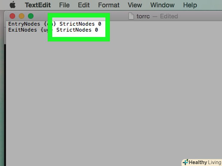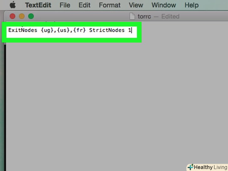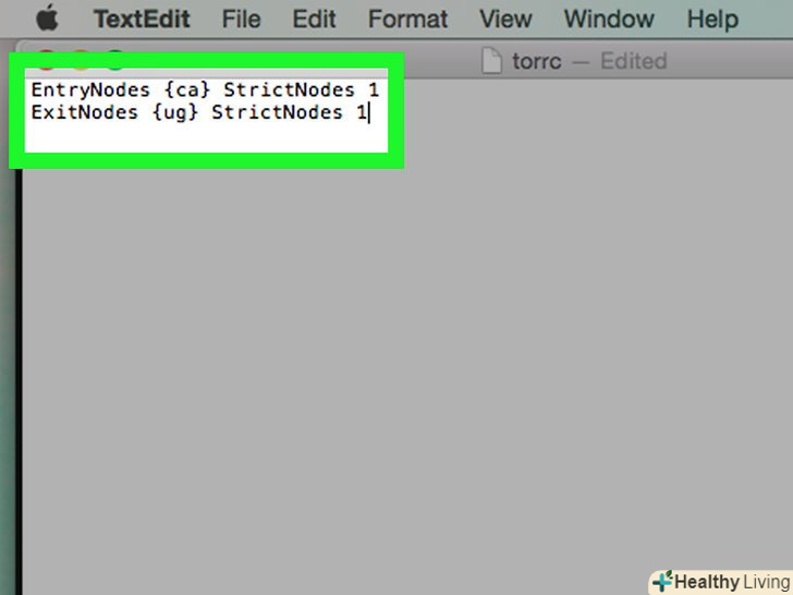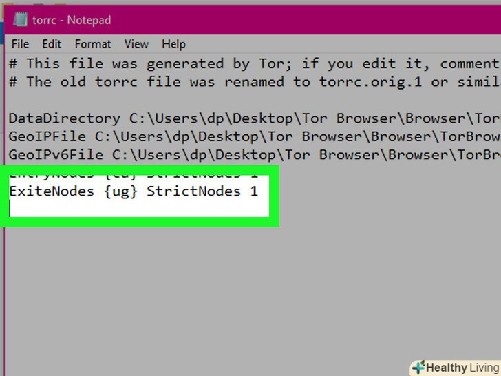 Додайте рядок "ExitNodes". Введіть ExitNodes {} StrictNodes 1 натисніть ↵ Enter.