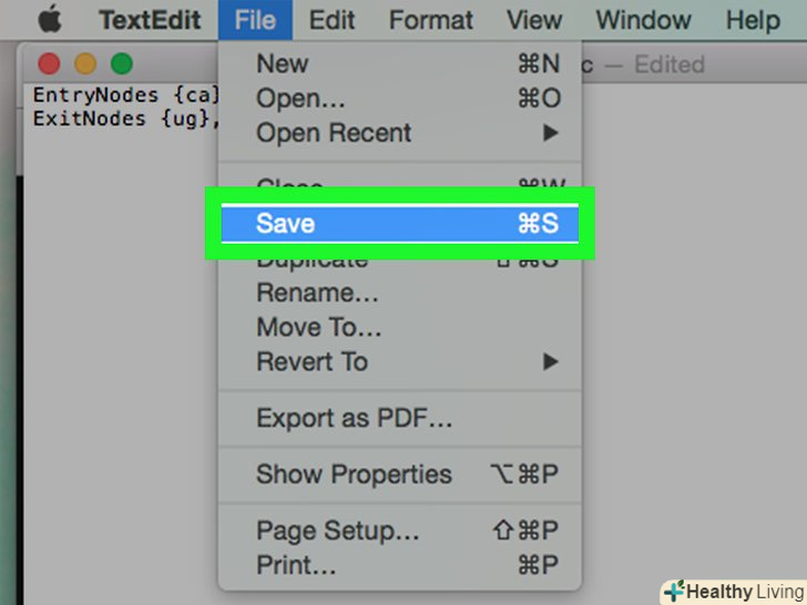 Замініть вихідний файл "torrc" на оновлений. натисніть ⌘ command+s, потім закрийте TextEdit. Так ви збережете налаштування з певними країнами.