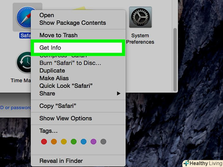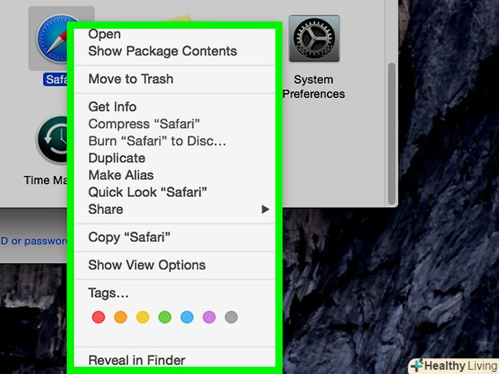 Клацніть правою кнопкою мишки на Safari. перед вами має з'явитися контекстне меню з різними пунктами.- Якщо ви вибрали Safari через панель «Dock», виберіть опцію «Властивості» і натисніть на кнопку «Показати в Finder». Після цього відкриється вікно Finder. Клацніть правою кнопкою миші по іконці Safari у вікні Finder.