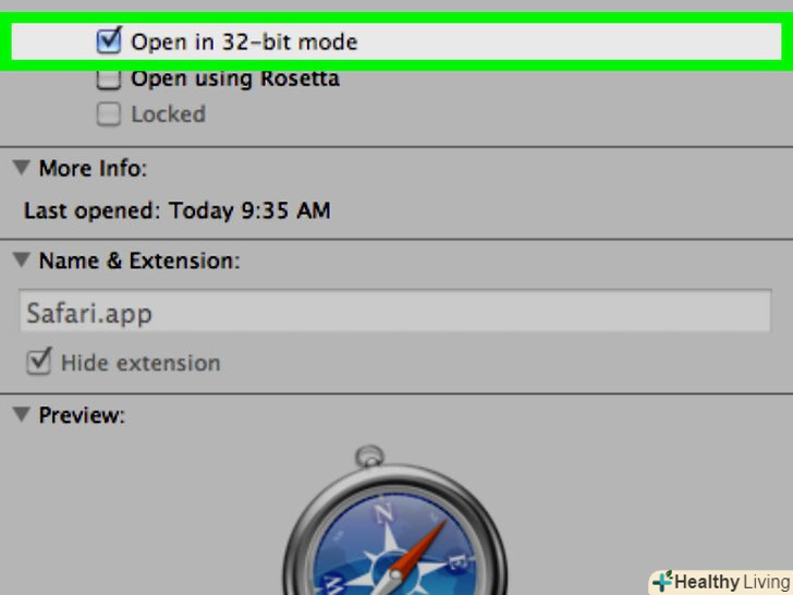 Поставте галочку в поле поруч з написом: «відкрити в 32-бітному режимі». При наступному запуску Safari повинен запуститися в 32-бітному режимі.