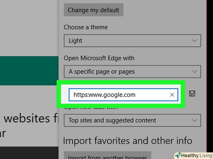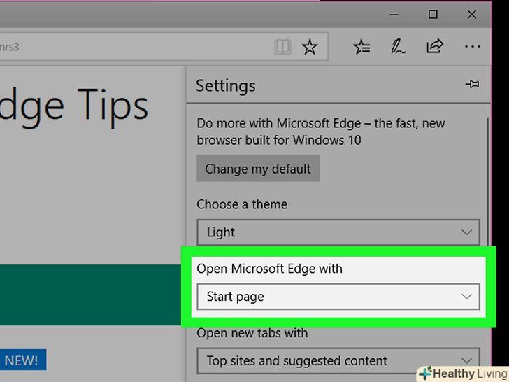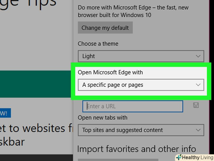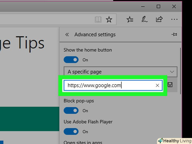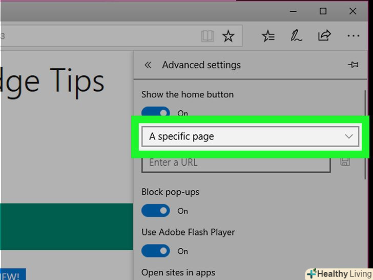 Пересуньте повзунок у «Показати кнопку додому» в положення " включити». під повзунком відобразиться меню, а зліва від адресного рядка браузера Edge з'явиться кнопка «Додому».