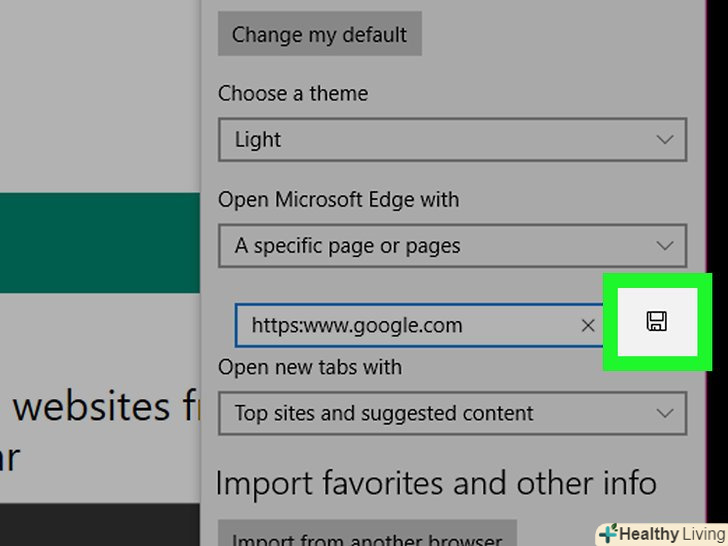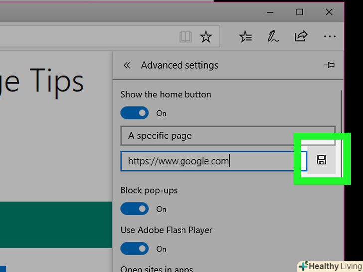 Натисніть "Зберегти". ця опція відзначена значком у вигляді дискети, який знаходиться праворуч від введеної адреси сайту. Сайт буде встановлений в якості стартової сторінки, тобто він буде завантажуватися при кожному запуску браузера Edge.