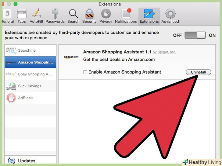 Відкрийте меню «Safari «і виберіть в ньому» Налаштування «gt;»Розширення". відкриється список розширень, які встановлені в Safari. Виберіть Усі невідомі або невикористовувані розширення, а потім натисніть Видалити . Шкідливими розширеннями є:- Amazon Shopping Assistant від Spigot Inc.