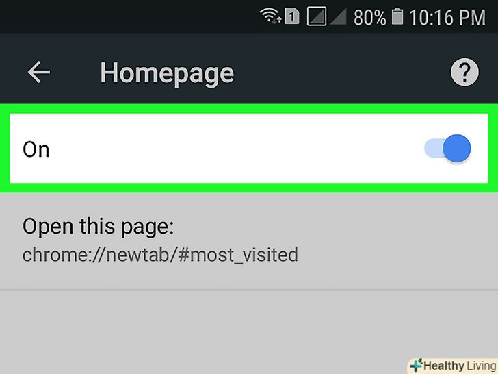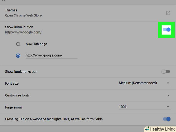Натисніть на повзуноку Відображати кнопку " Додому» . він знаходиться вгорі меню «Зовнішній вигляд». Значок у вигляді будиночка з'явиться зліва від адресного рядка.