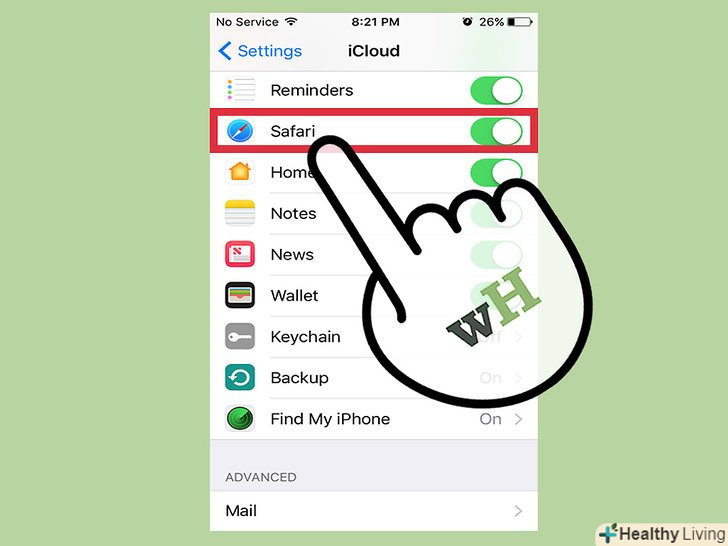Прокрутіть сторінку і знайдіть на ній "Safari". тепер пересуньте повзунок у цій опції в положення «включити». Якщо повзунок зелений, Safari вже синхронізується з iCloud.