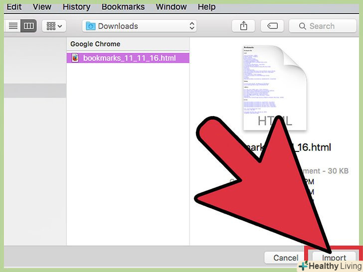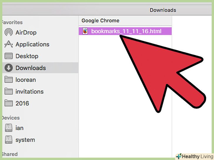 Підтвердьте місце розташування файлу. тепер файл готовий до імпорту в Safari!- Якщо ви переносите закладки з одного комп'ютера на інший, скопіюйте файл закладок на флеш-накопичувач або завантажте його в хмарне сховище (наприклад, iCloud або Google Диск), а потім перенесіть файл на інший комп'ютер.