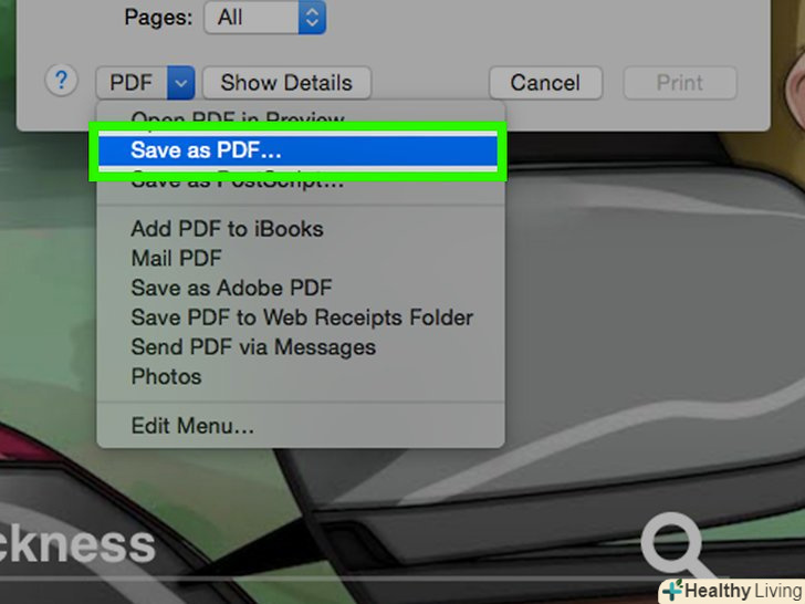 Відкрийте меню «Файл» і виберіть «Експортувати як PDF». для цього вам знадобиться OS X 10.9 (Mavericks) або версія новіше. Якщо ви використовуєте попередню версію, натисніть «Файл» → «Зберегти як», а потім виберіть PDF як тип файлу, що зберігається.