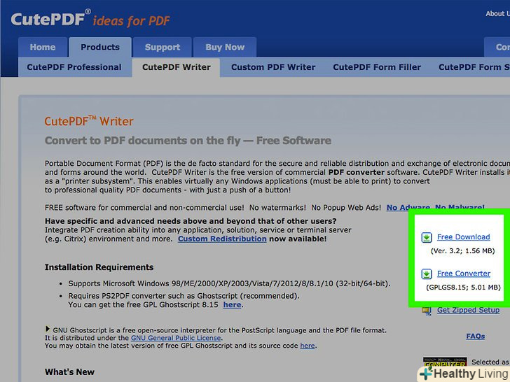 Скачайте CutePDF. в Internet Explorer і Firefox немає вбудованих інструментів для створення PDF-файлів. Замість цього вам доведеться встановити «віртуальний принтер», який замість друку буде створювати PDF-файл. CutePDF якраз і є одним з таких віртуальних принтерів.- Перейдіть на сайт cutepdf.com/products/cutepdf/writer.asp і натисніть на «Free Download» (Безкоштовне завантаження) і «Free Converter» (безкоштовний конвертер), щоб завантажити дві програми, необхідні для установки.