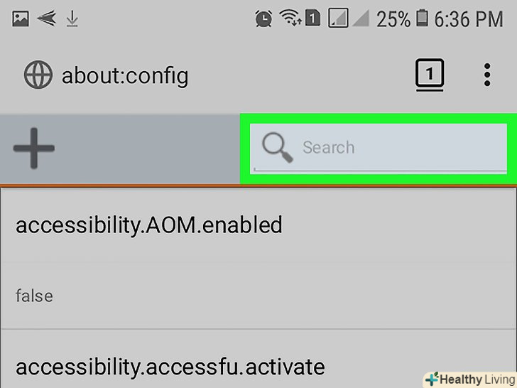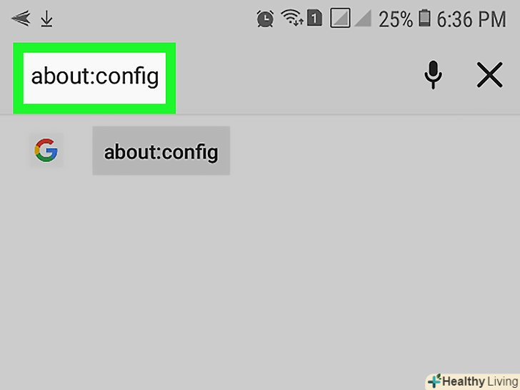 Перейдіть на сторінку конфігурації. введіть about:config і натисніть «Пошук» на екранній клавіатурі. [1]