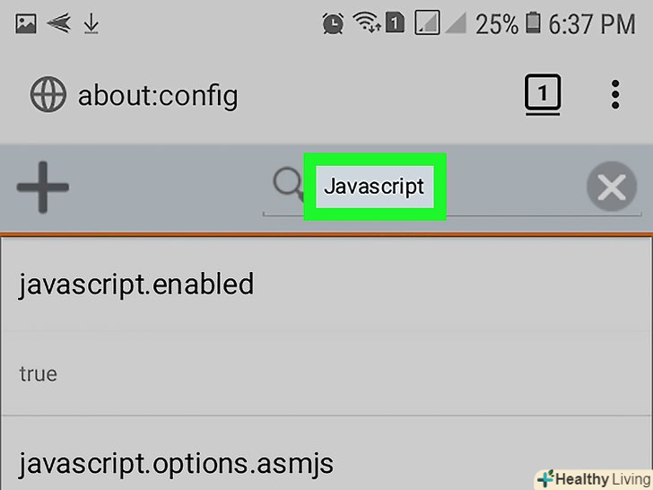 Знайдіть опцію JavaScript. введіть javascript , а потім знайдіть параметр «javascript.enabled " у верхній частині сторінки.