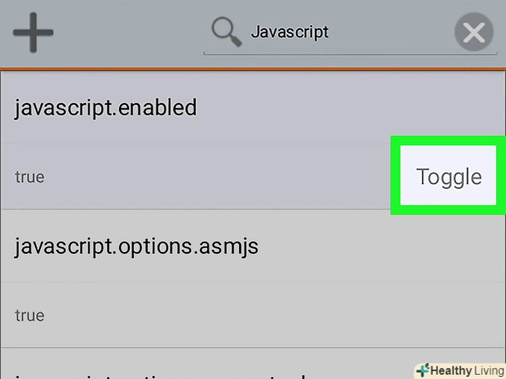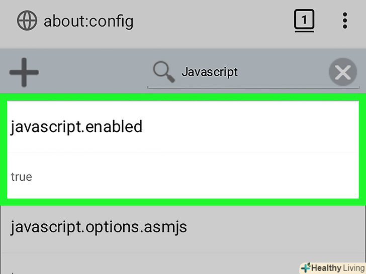Торкніться опції «javascript.enabled». вона знаходиться вгорі сторінки. У правій частині сторінки відобразиться кнопка "Переключити".- Якщо під опцією " javascript.enabled "відображається" false "(брехня), JavaScript вже відключений.