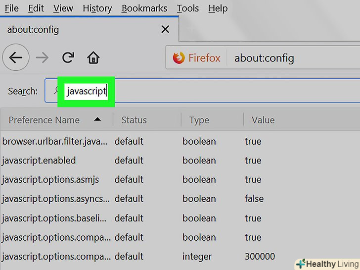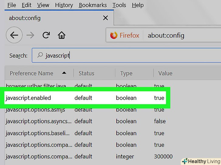 ТоркнітьсяПереключити . ця кнопка знаходиться в правій нижній частині вікна «javascript.enabled». Значення параметра зміниться на "false" - це означає, що JavaScript відключений.- Якщо оновити Firefox, вам, можливо, доведеться знову відключити JavaScript.