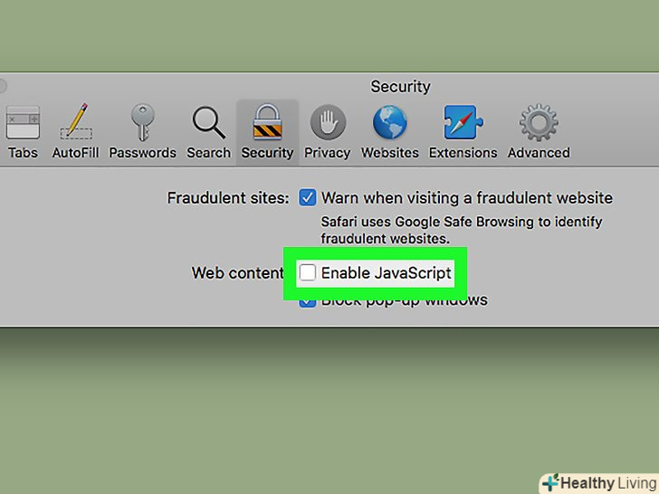 Зніміть прапорець біля "включити JavaScript". ця опція знаходиться поруч із заголовком «Веб-контент» посередині вікна. JavaScript буде вимкнено.- Якщо прапорця немає, JavaScript вже відключений.
