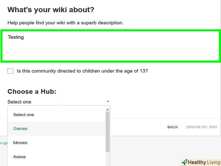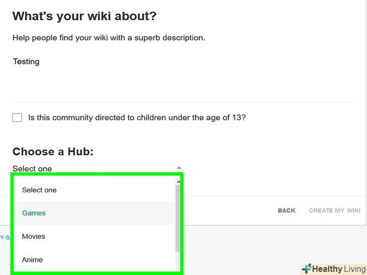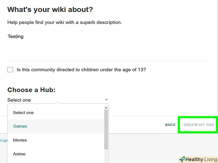 Виберіть категорію. Натисніть на випадаюче меню "Choose a Hub" (вибрати категорію) і виберіть в ньому категорію для вашого wiki-сайту.- Вибравши Основну категорію, Ви зможете вибрати і більш конкретні категорії.