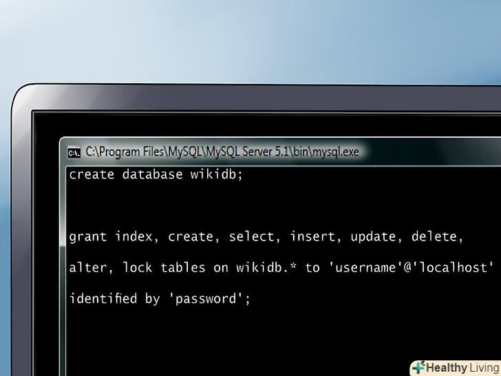 grant index, create, select, insert, update, delete, alter, lock tables on wikidb.* to ' username '@' localhost ' identified by ' password ';- Замініть username і password на ім'я користувача та пароль, який ви будете використовувати як власник wiki.