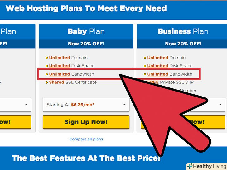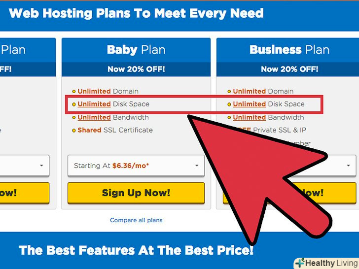 Дізнайтеся обсяг виділеного простору для зберігання всього вмісту сайту. під вмістом маються на увазі веб-сторінки, зображення, відеоролики, бази даних та інший контент. Якщо ваш сайт не переповнений контентом, то вам, швидше за все, знадобиться не більше 100 МБ.- Багато хостингів надають необмежений простір, але це вам не потрібно, якщо ваш сайт не переповнений контентом. Насправді будьте обережні з такими хостингами, тому що надати необмежений простір технічно неможливо, тобто сервери такого хостингу коли-небудь переповняться, що призведе до зниження швидкості роботи вашого сайту.