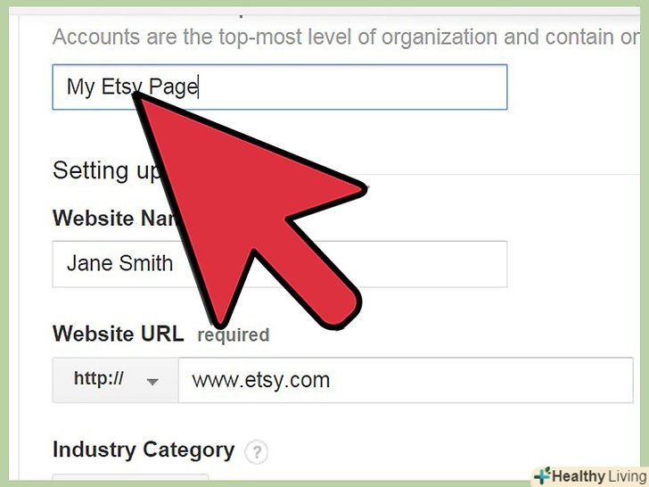 Введіть інформацію про магазин. введіть назву вашого магазину на Etsy в полях 'Назва аккаунта' і 'назва сайту', і введіть www.etsy.com у полі 'URL веб-сайту'.