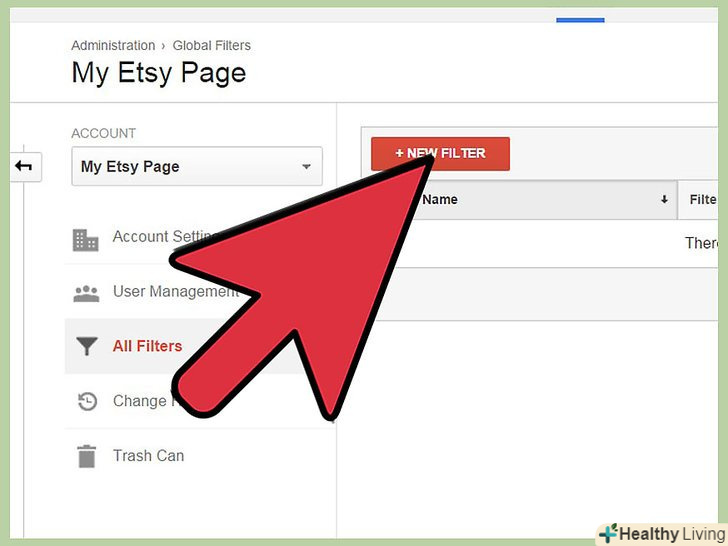 Увійдіть в обліковий запис Google Analytics і натисніть Адміністратор. Виберіть ваш аккаунт Etsy в випадаючому меню Аккаунт, і виберіть 'всі фільтри' ('All Filters'). Натисніть ' новий фільтр '('New Filter').