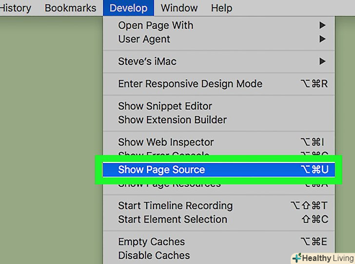 НатиснітьПоказувати програмний код сторінки . ця опція знаходиться в нижній частині меню, що випадає. У вікні Safari відобразиться вихідний код веб-сторінки.- Також можна натиснути⌥ Option + ⌘ Command + U , щоб відобразити вихідний код.