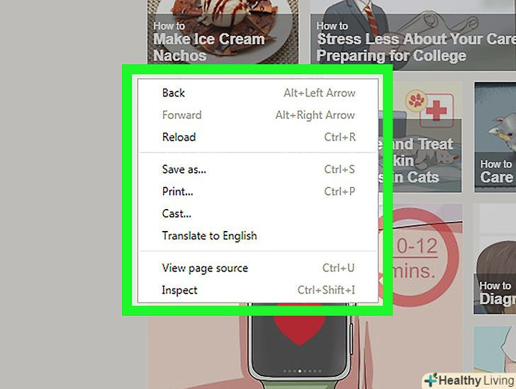 Клацніть правою кнопкою миші на сторінці. якщо у Вас Mac-комп'ютер і всього одна кнопка миші, затисніть Control і клацніть лівою кнопкою миші. Якщо у вас ноутбук з трекпадом, клацніть по ньому двома пальцями. Відкриється контекстне меню.- Не клацайте правою кнопкою миші по посиланню або фотографії, тому що так відкриється інше меню.