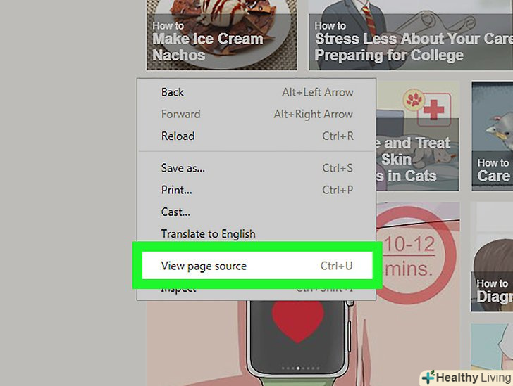 Клацніть поПерегляд коду сторінки або Вихідний код сторінки . вихідний код сторінки відобразиться в новому вікні або в нижній частині поточного вікна.- В Chrome клацніть по «Перегляд коду сторінки», в Firefox по «Вихідний код сторінки», в Edge і Internet Explorer по «Перегляд коду».