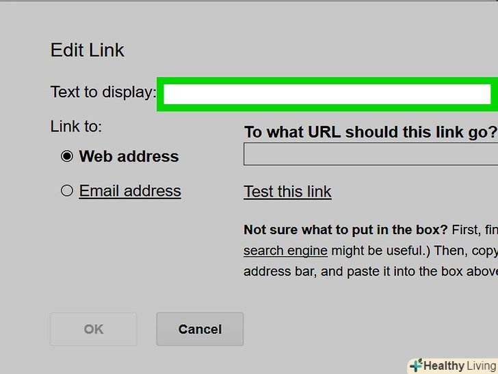 Введіть текст гіперпосилання. у текстовому полі "відображуваний текст», «Текст "або" http://» введіть текст, під яким буде приховано адресу веб-сторінки.- Наприклад, у вказаному полі Введіть слова «натисніть тут», щоб створити посилання на сторінку, яка відкриється, коли одержувач листа клацне по фразі «натисніть тут».