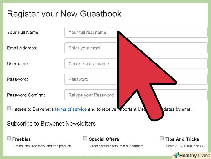 Створіть обліковий запис.вам знадобиться створити обліковий запис, щоб скористатися послугами будь-якої з перерахованих вище служб. За допомогою цього облікового запису ви зможете змінювати налаштування своєї гостьової книги, оскільки зробити це через блог не представляється можливим, так як база даних гостьової книги буде знаходитися на серверах служби гостьових книг.- При створенні облікового запису вас попросять ввести адресу свого блогу. Це дозволить службі підключитися і приписати гостьову книгу до Вашого сайту для правильного відстеження відповідей.
