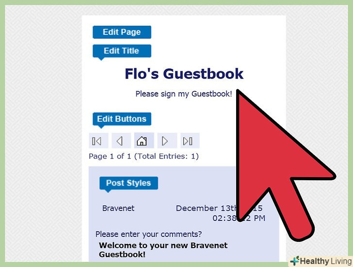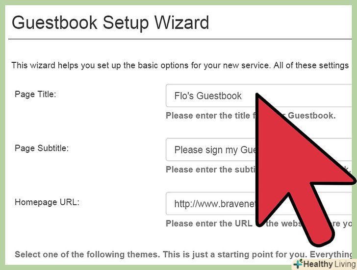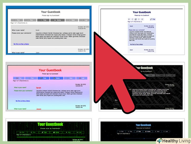 Настройте свою гостьову книгу.використовуйте вбудований редактор або панель управління, щоб налаштувати гостьову книгу на свій смак. Якщо Ви користуєтеся послугами Bravenet, можете налаштувати кольори гостьової книги так, щоб вони в точності відповідали темі вашого блогу на Blogger. Крім того, щоб прискорити настройку гостьової книги, можете зупинити свій вибір на одній з безлічі готових тем.