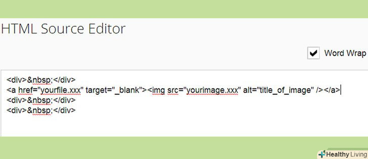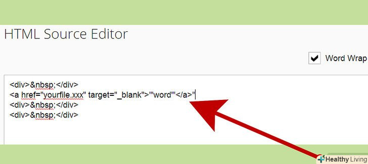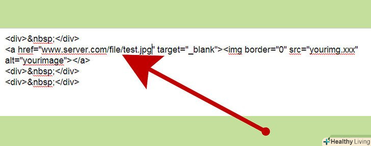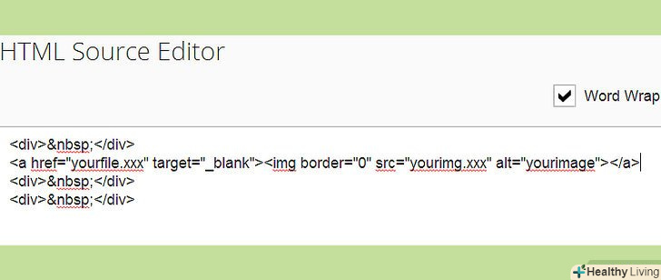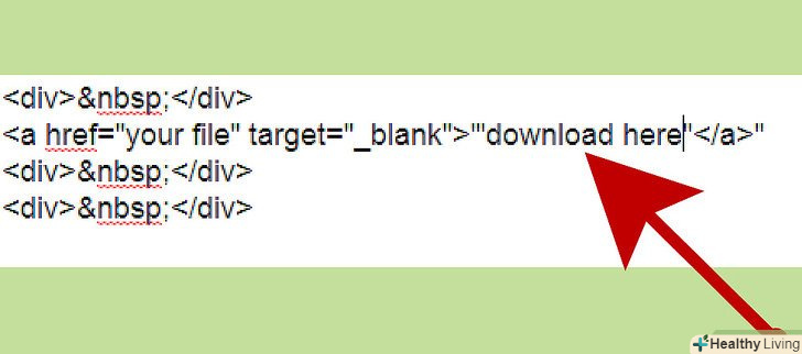 Замініть ім'я_файлу.xxx на назву файлу, який буде завантажуватися, аСлово - на те слово, яке буде містити посилання. --gt; перейдіть до кроку 8- Вставте наступний код в тому місці, де буде стояти посилання на файл: lt;a href="імя_файла.xxx" target="_blank"gt;lt;img src=" Картинка. xxx " alt=" Имя_картинки " /gt;lt;/agt;