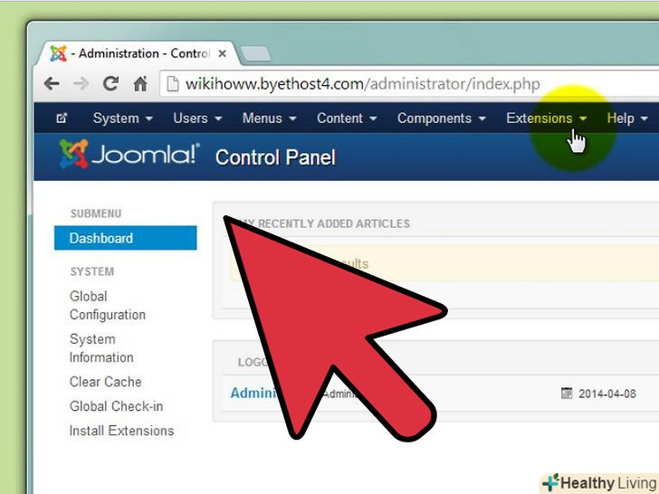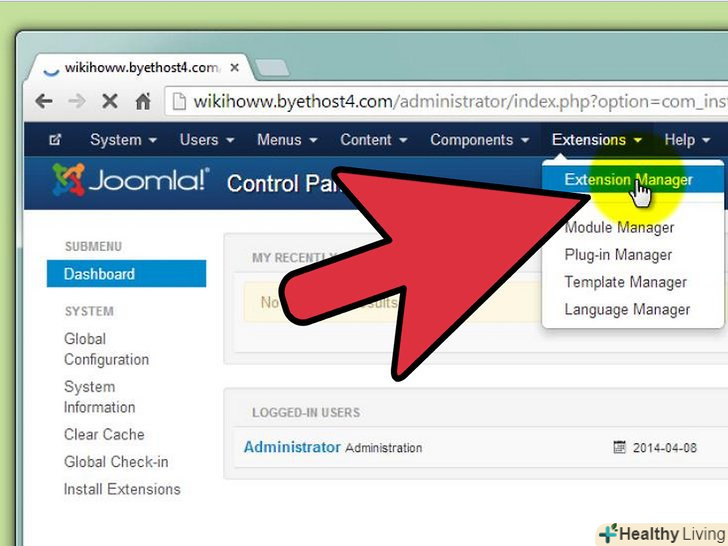 Увійдіть в розділ адміністратора вашого сайту. для стандартних сайтів Joomla він розташований наwww.your-site.com/administrator.