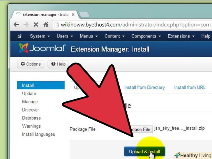 Виберіть вашу опцію установки. вам доведеться вибирати з трьох різних пакетів установки. Виберіть той, який підходить розташуванню вашого файлу:- Upload Package File - дозволить вам завантажити пакет архівного файлу на ваш комп'ютер. Фонова програма Joomla встановить його автоматично. Натисніть "Upload", щоб знайти файл на вашому комп'ютері. Як тільки ви оберете, натисніть кнопку Upload amp; Install, щоб завантажити шаблон.