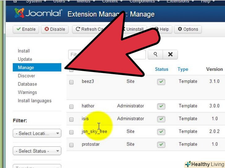 Підтвердьте установку. як тільки ви встановите шаблон, ви можете переконатися, що він працює, натиснувши на меню "Manage" в лівій частині сторінки. Встановіть фільтр для "template" і пошукайте ваш новий шаблон в списку.