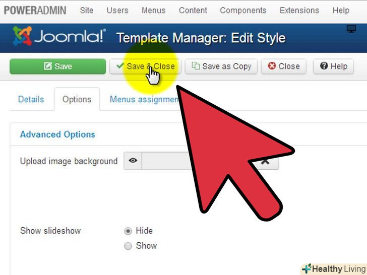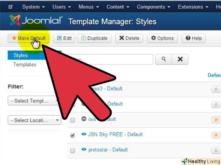 Увімкніть ваш шаблон. натисніть В меню Template Manager на прапорець поруч з шаблоном, який ви хочете активувати. Як тільки ви виберете його, натисніть на кнопку Make Default, яка має форму зірочки. Після цього шаблон буде завантажений на ваш сайт. [1]
