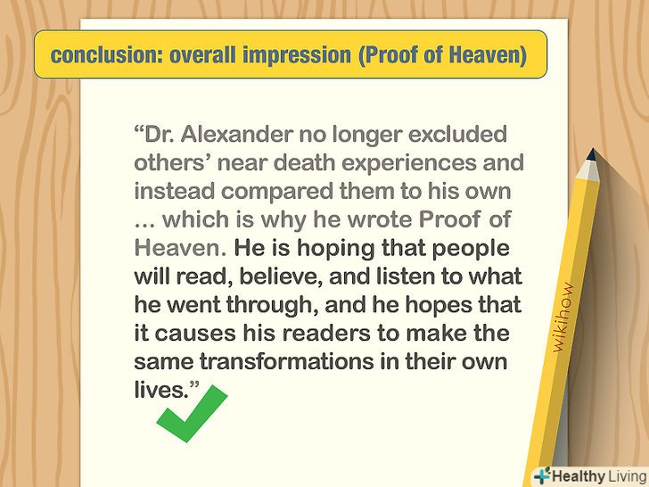 Підготуйте висновок.у висновку необхідно зробити огляд основних ідей книги і висловити свою власну думку про неї. Вам сподобалася книга? Вона доставила вам задоволення? Ви згодні з ідеями автора і його манерою писати? Чи дізналися ви щось, чого не знали раніше? Наведіть доводи на свою користь, використовуйте приклади або навіть цитати на підтримку вашої думки.[9]- Нехай висновок дає читачам зрозуміти, слід читати книгу чи ні. Чи сподобається вона читачам? Чи повинні вони прочитати її? Чому так чи чому ні?