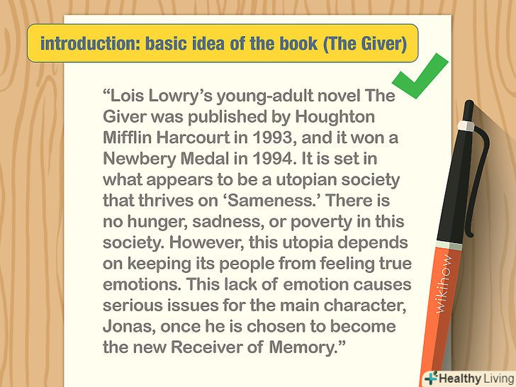 - Наприклад, короткий виклад роману Луїс Лоурі " дає "могло б виглядати наступним чином: «Роман Луїс Лоурі» дає «був опублікований видавцем» Houghton Mifflin Harcourt" в 1993 році. У 1994 році він був нагороджений медаллю Ньюбері. Дія роману відбувається в суспільстві, яке представляється утопічним, в якому процвітає ідея однаковості. У цьому суспільстві немає голоду, печалей або злиднів. Однак ця утопія тримається на тому, що утримує людей від переживання справжніх емоцій. Така відсутність емоцій є причиною серйозних проблем у головного героя Джонаса, коли його обрали новим одержувачем пам'яті..."[5]
