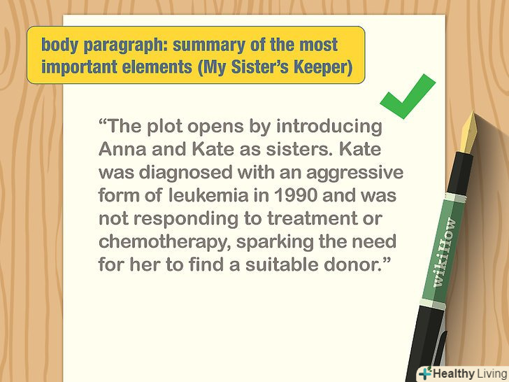 Підготуйте основні абзаци. виходячи зі складених раніше заміток і начерків, напишіть основну частину викладу з описом найбільш важливих елементів книги. Якщо ви працюєте над досить довгим твором, то можете відобразити кожну деталь і навіть кожну главу коротко. Замість розповіді зосередьтеся на тому, що представляється вам найважливішим в самій книзі і її персонажах.[7]- Зверніть увагу, що конспект повинен фокусуватися на тому, що ви вважаєте основною ідеєю автора, і на тому, який розвиток ця ідея отримує в книзі. На яких важливих моментах автор робить акцент? Які спостереження або розповіді зі свого власного досвіду використовує він на підтримку своєї думки?