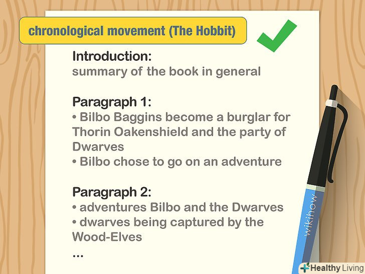 - Складайте виклад залежно від того, де відбуваються значні події. Наприклад, якщо ви готуєте виклад роману Дж.Р. Р. Толкієна "Хоббіт", ви могли б організувати свою роботу наступним чином: