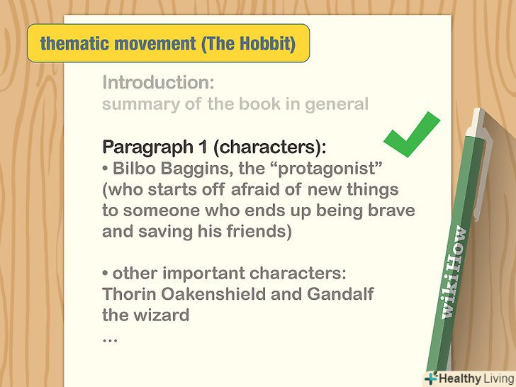 - Наприклад, абзац, присвячений персонажам "Хоббіта", буде найбільше зосереджений на Більбо Беггінсі, або на головному герої роману. Необхідно буде також обговорити деяких інших важливих дійових осіб: Торіна Дубощіта і чарівника Гендальфа. У цьому абзаці слід розглянути розвиток характеру Більбо від персонажа, що боїться всього нового, до Хоббіта, який в кінці постає сміливцем, який рятує своїх друзів.