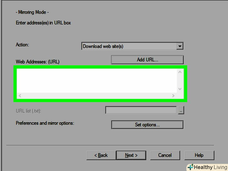 Вставте адресу сайту в адресний рядок в програмі для скачування сайтів. розташування цього рядка залежить від програми, але, швидше за все, ви знайдете її у верхній частині вікна програми.- У вікні програми можна також вибрати параметри скачування, наприклад, типи файлів, які завантажувати не потрібно, або папку для завантаження веб-сайту.