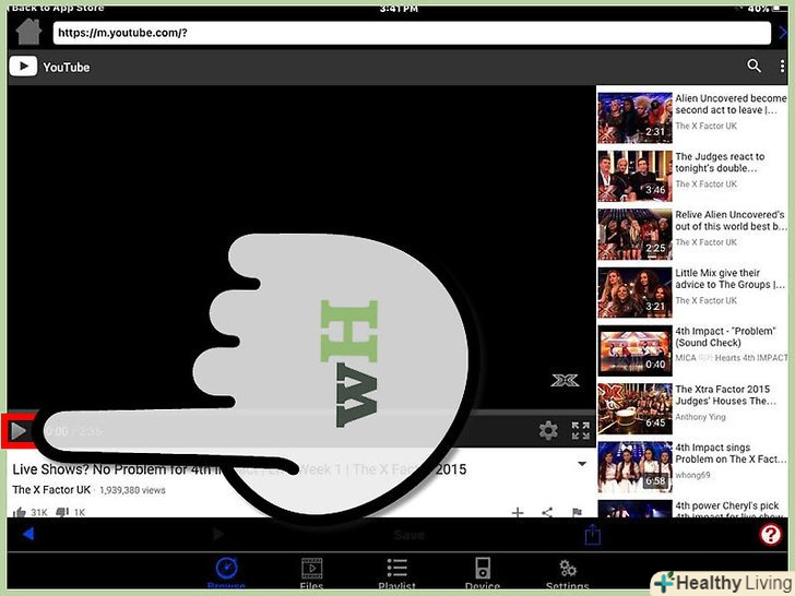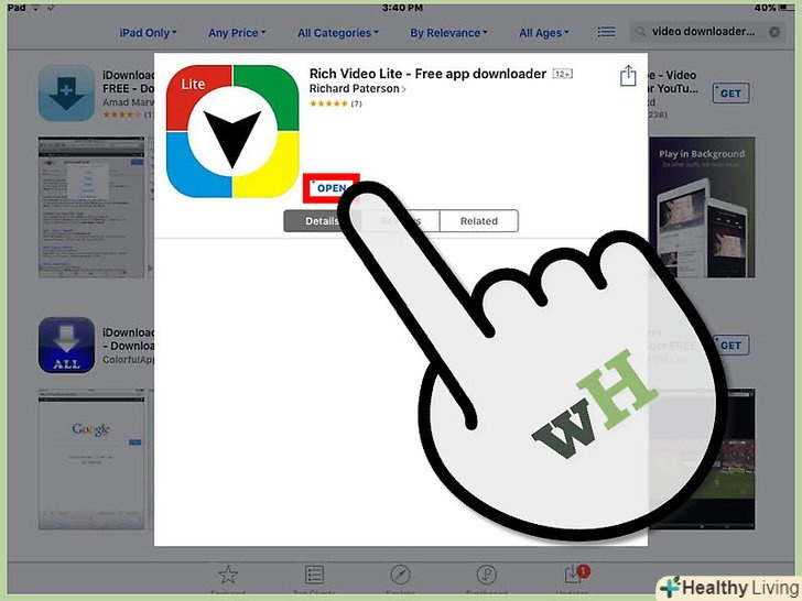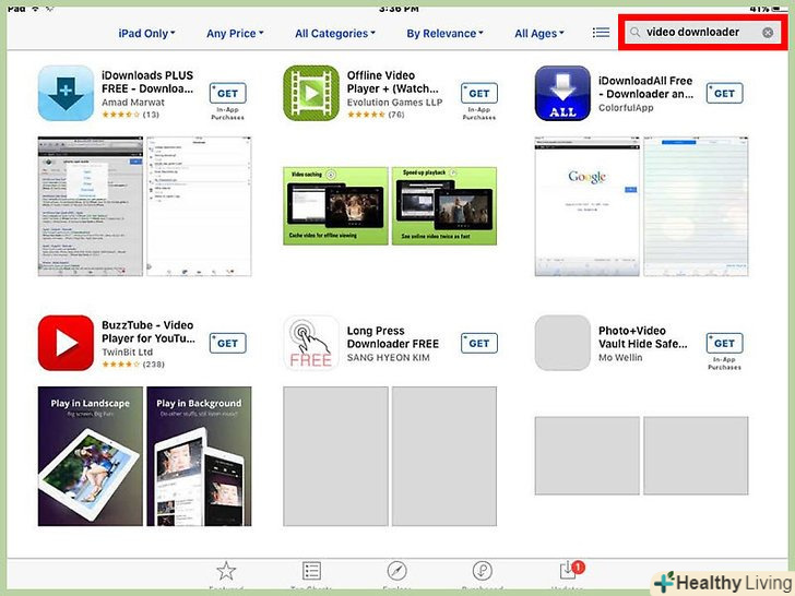 Вбийте в пошук фразу "завантажувач відео" і скачайте додаток, сумісний з відео на YouTube.На даний момент ІТ-експерти рекомендують використовувати додаток "Video Downloader Lite Super", розроблену Джорджем Янгом, так як воно поширюється на безкоштовній основі і не містить реклами і спливаючих вікон.[1]- Якщо для завантаження програми на iPad ви використовуєте iTunes, встановлений на комп'ютері, ви зможете знайти сторінку програми Video Downloader Lite Super за адресою:https://itunes.apple.com/am/app/video-downloader-lite-super/id661041542?mt=8.